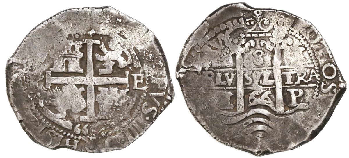 Potosi, Bolivia, cob 8 reales, 1666E. S-P37a; KM-21; CT-455. 27.52 grams. Good full cross and pillars-and-waves (both well centered), two dates and assayers ("666" below cross), richly toned VF with minor flat areas.