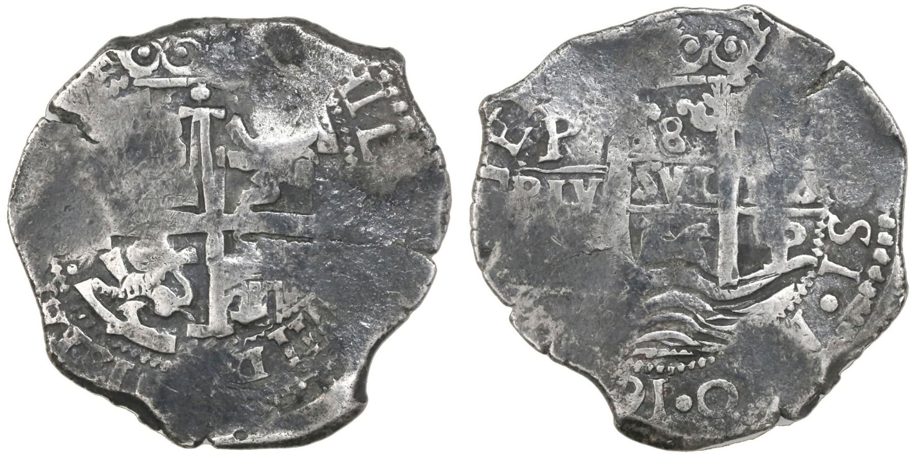 Potosi, Bolivia, cob 8 reales, 1666E. S-P37a; KM-21; CT-455. 27.02 grams. Broad flan with flat spots but no corrosion, toned all over, parts of all three dates. Recovered from: Unidentified ca.-1671 wreck in Seville Harbor, Spain