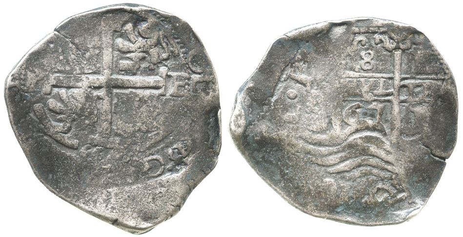 Potosi, Bolivia, cob 8 reales, 1667E. S-P37a; KM-21; CT-342. 23.9 grams. Crudely worn and darkly toned (not much contrast) but with clear date and assayer, light corrosion. Recovered from: Unidentified ca.-1671 wreck in Seville harbor