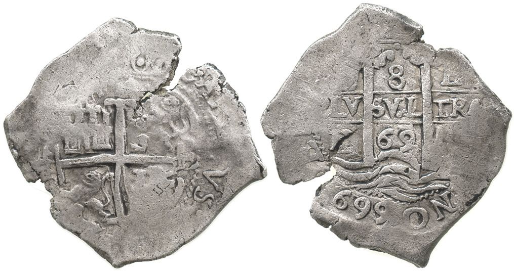 Potosi, Bolivia, cob 8 reales, 1669E, 2 bold dates on pillars side (rare thus). S-P37b; KM-26; CT-344. 26.7 grams. Choice full pillars-and-waves with bold 69 in between and 669 in legend, full and well-centered cross, lightly toned and corrosion-free but with prominent edge-crack. Recovered from: Unidentified ca.-1671 wreck in Seville harbor