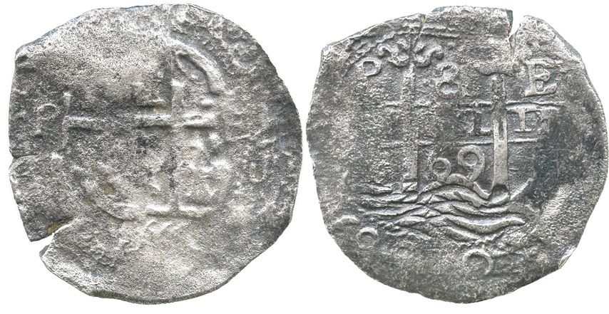 Potosi, Bolivia, cob 8 reales, 1669E. S-P37b; KM-26; CT-344. 19.8 grams. Well-centered full pillars-and-waves with bold date in between and second date in legend, messily doubled cross, darkly toned and lightly to moderately corroded all over. With 2001 photo-certificate. Recovered from: Unidentified ca.-1671 wreck in Seville harbor