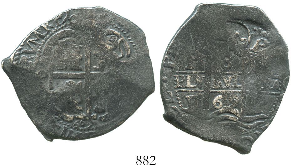 Potosi, Bolivia, cob 8 reales, 1669E. S-P37b; KM-26; CT-344. 25.2 grams. Two clear dates despite flatness (but no corrosion to speak of), typically darkly toned (uncleaned), decent cross and well-centered strike. Recovered from: Piedmont, sunk in 1795 off Cornwall, England