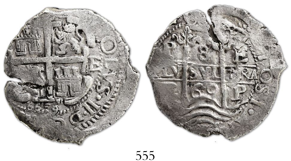 Potosi, Bolivia, cob 8 reales, 1669E. S-P37b; KM-26; CT-344. 25.74 grams. Choice full pillars-and-waves, nice but off-center full cross with bold king's name and ordinal as a result, no corrosion, light toning, large edge-split, two dates (669 below cross). Recovered from: Unidentified ca.-1671 wreck in Seville harbor, Spain