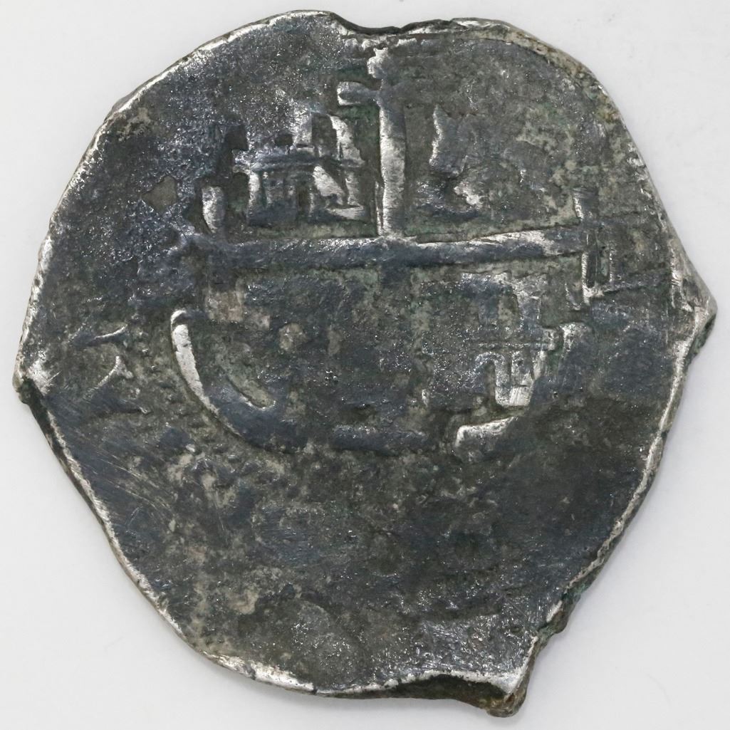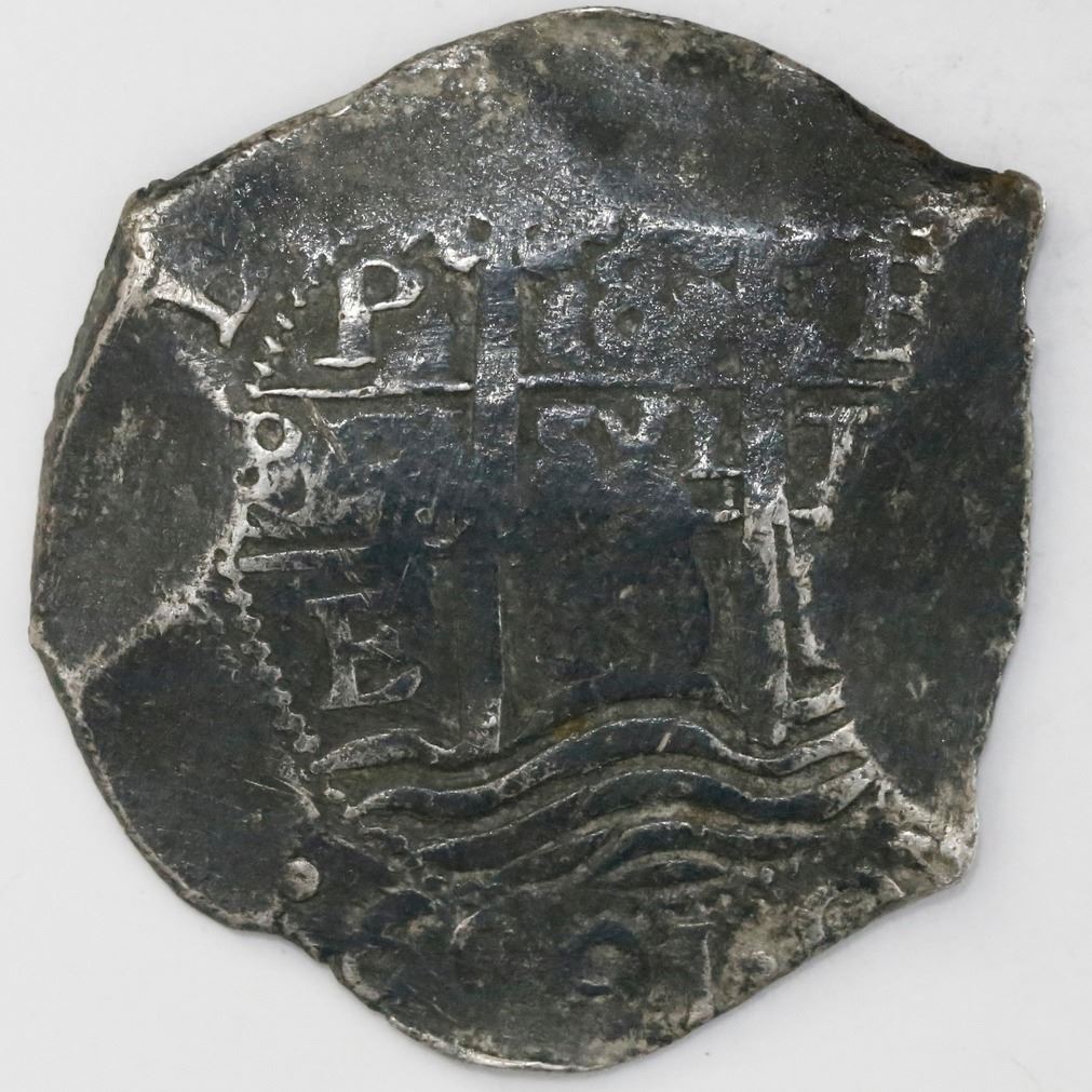 Potosi, Bolivia, cob 8 reales, 1669E. S-P37b; KM-26; CT-344. 26.85 grams. Dark with some light encrustation, original surfaces with faint corrosion, clear two dates with weak but present date between pillars. Recovered from: Unidentified ca.-1671 wreck in Seville Harbor, Spain