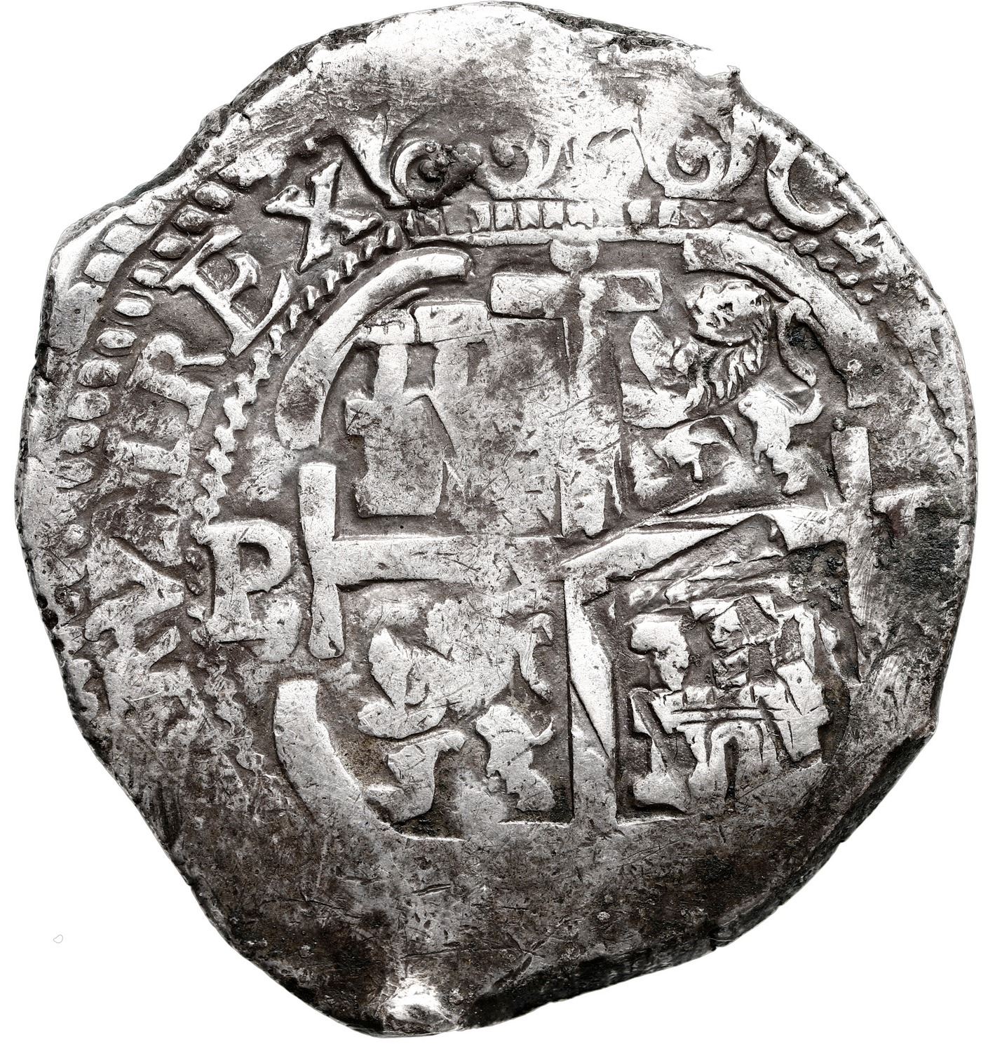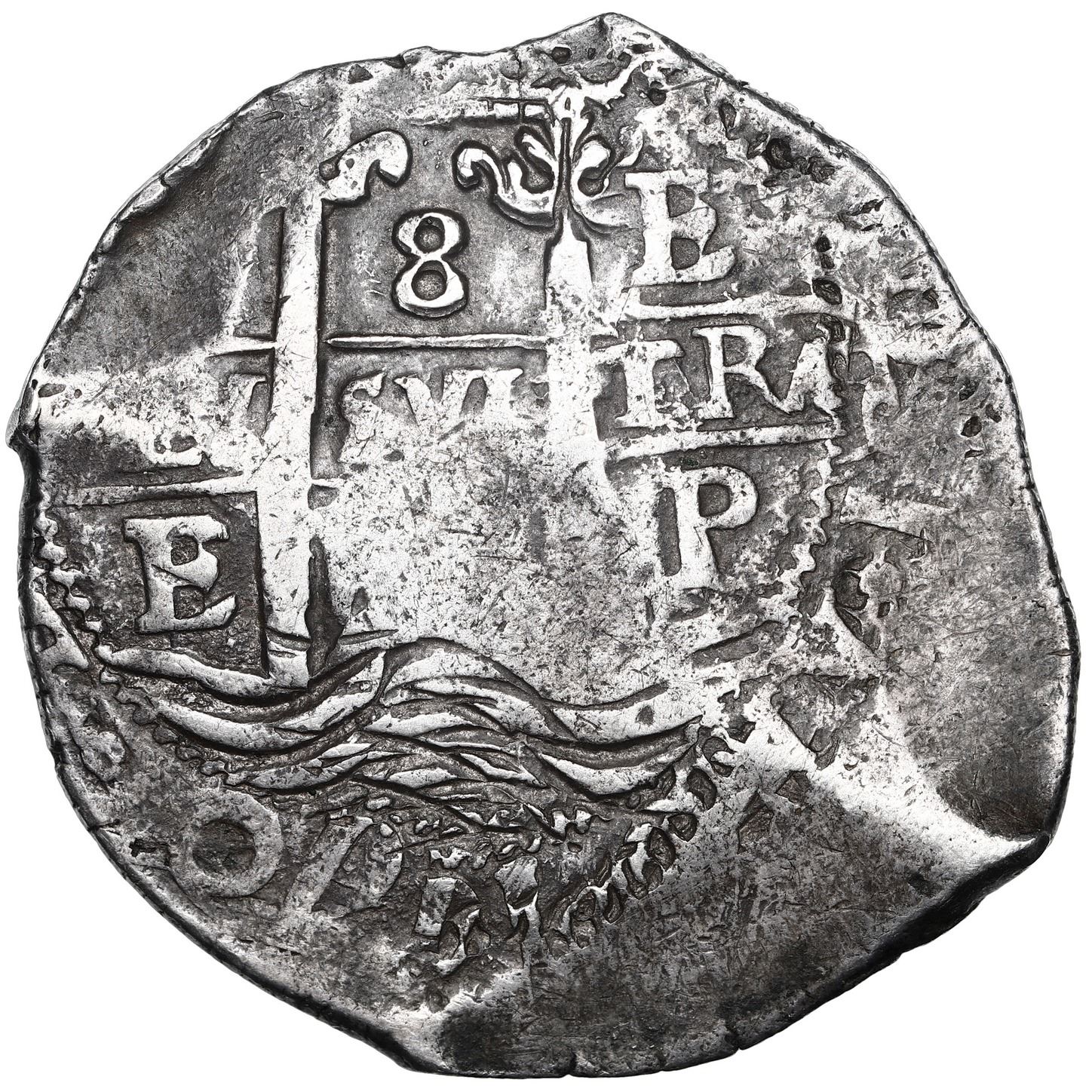 Potosi, Bolivia, cob 8 reales, 1670 E. S-P37b; KM-26; Cal-701. 26.74 grams. Full but doubled cross, full but partially flat pillars-and-waves with full 70 of date in legend, deeply toned VF. Pedigreed to the Ponterio auction of April 1994, with original lot-tag 929.