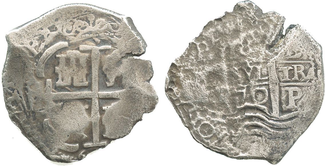 Potosi, Bolivia, cob 8 reales, 1670E. S-P37b; KM-26; CT-345. 17.7 grams. Good full cross (no corrosion), full pillars-and-waves (heavily corroded on half) with 2 dates on that side, edge-split, nicely toned. Recovered from: Princess Louisa, sunk in 1743 off the Cape Verde Islands, west of Africa