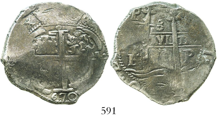 Potosi, Bolivia, cob 8 reales, 1670E. S-P37b; KM-26; CT-345. 26.7 grams. Three dates, full cross and pillars but much flatness, no corrosion, toned all over (no contrast). Recovered from: Unidentified ca.-1671 wreck in Seville harbor