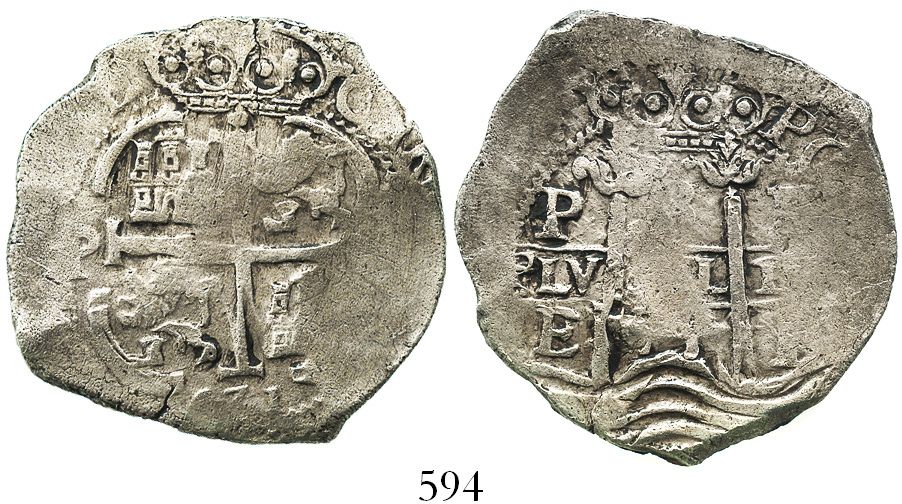 Potosi, Bolivia, cob 8 reales, 1671E. S-P37b; KM-26; CT-346. 24.7 grams. Bold pillars-and-waves, choice full crown on other side, no corrosion but much flatness, good toning. Recovered from: Unidentified ca.-1671 wreck in Seville harbor