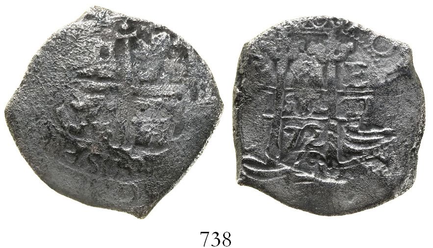 Potosi, Bolivia, cob 8 reales, 1672E. S-P37b; KM-26; CT-347. 19.03 grams. Thin from wear and corrosion but with full pillars and cross, clear date and assayer, typically dark. Recovered from: Piedmont, sunk in 1795 off Cornwall, England