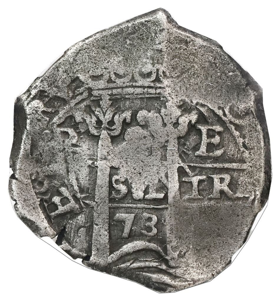 Potosi, Bolivia, cob 8 reales, 1673E, NGC F 15. S-P37b; KM-26; Cal-704. 27.05 grams. Chunky flan with full cross and pillars (the tops particularly well detailed), bold date and assayer, lightly toned over slightly porous surfaces. NGC #4435028-003. Pedigreed to the Arturo Rosenheim collection.