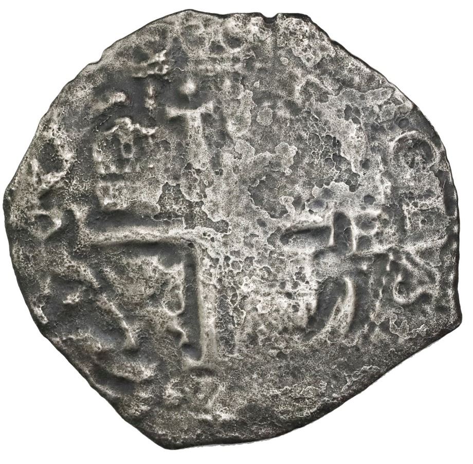 Potosi, Bolivia, cob 8 reales, 1673E. S-P37b; KM-26; Cal-704. 19.13 grams. Typically corroded but with full waves and choice top of left pillar, full cross and part of king's name, three dates and assayers, two mintmarks, nicely toned. With ROBCAR tag and photo-certificate #2020234. Recovered from: Consolacion, sunk in 1681 off Santa Clara Island, Ecuador