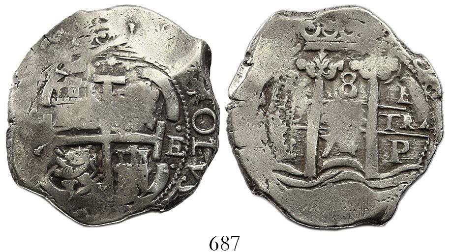 Potosi, Bolivia, cob 8 reales, 1674E. S-P37b; KM-26 ;CT-349. 27.30 grams. Full and well-centered pillars, nearly full cross, bold mintmark and king's name, Fine+ with lots of flat areas, lightly toned fields.