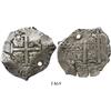 Potosi, Bolivia, cob 8 reales, 1674E. S-P37b; KM-26; CT-349. 26.5 grams. Great full cross, full pillars-and-waves, chunky but well-detailed AVF with good contrast, 3 dates and 2 assayers, holed near edge.