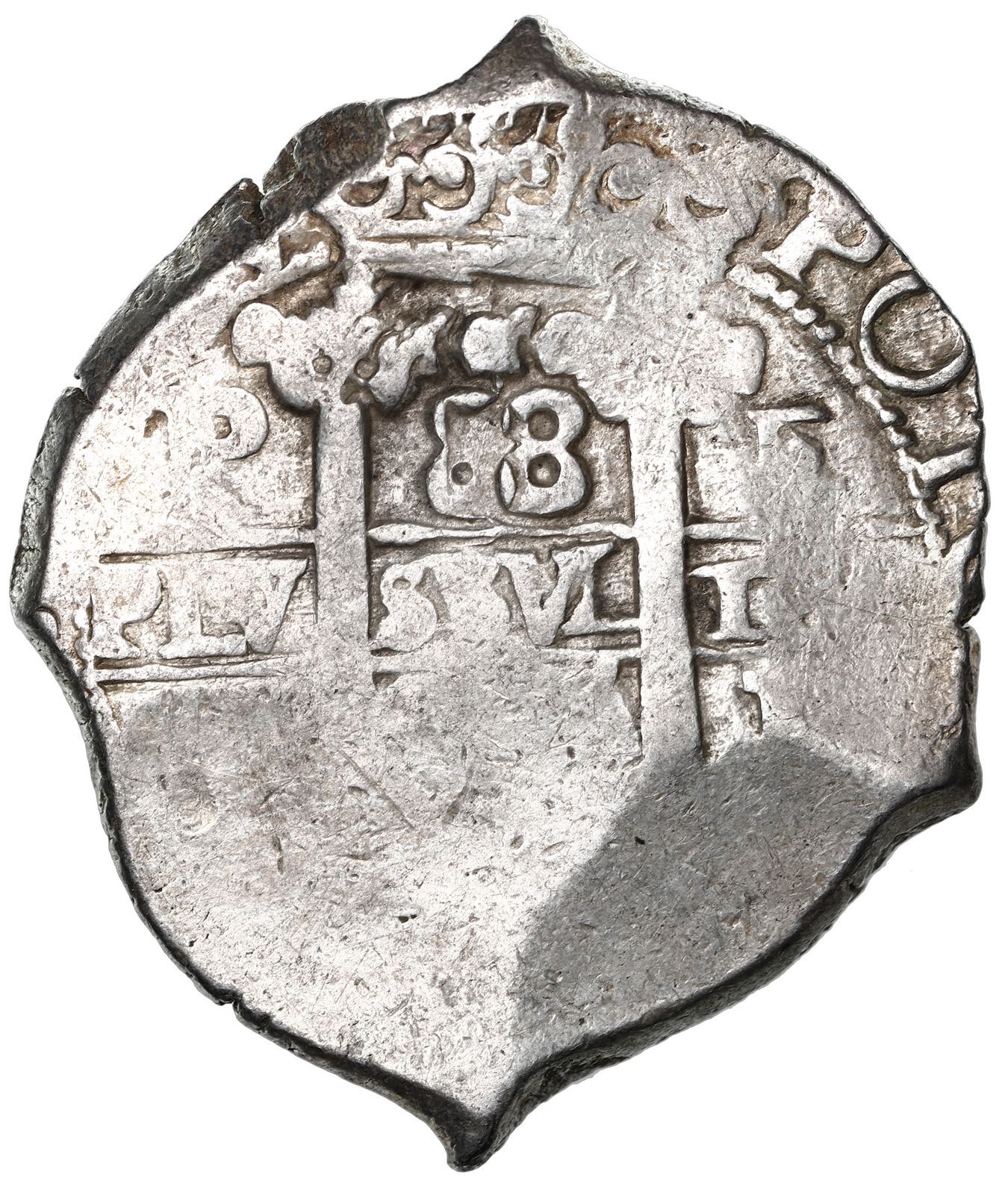 Potosi, Bolivia, cob 8 reales, 1675 E. S-P37b; KM-26; Cal-706. 26.32 grams. XF for actual wear but rather unevenly struck, about half flat, the date below the cross nevertheless full and the surfaces all very clean and untroubled. Pedigreed to the Ponterio auction of June 1994, with original lot-tag 154.