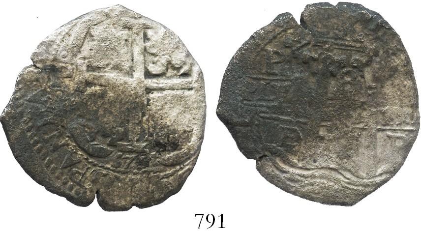 Potosi, Bolivia, cob 8 reales, 1675E, scarce mint for this wreck. S-P37b; KM-26; CT-350. 21.3 grams. Full but off-center cross with clear date below, full but doubled pillars, worn and corroded as usual, with area of dark toning. From the Joanna, sunk in 1682 off South Africa, with certificate from the salvager.