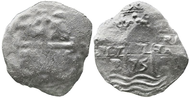 Potosi, Bolivia, cob 8 reales, 1675E. S-P37b; KM-26; CT-350. 13.0 grams. Bold date above full waves between full pillars, otherwise somewhat featureless due to heavy corrosion and thinning. With ROBCAR photo-certificate #830563. Recovered from: Consolacion, sunk in 1681 off Santa Clara Island, Ecuador