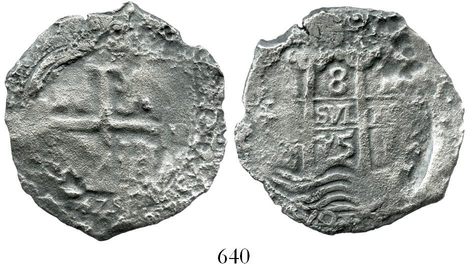 Potosi, Bolivia, cob 8 reales, 1675E. S-P37b; KM-26; CT-350. 19.6 grams. Nice pillars with bold denomination, 3 dates, moderate to heavy corrosion. From the Consolacion, sunk in 1681 off Santa Clara Island, Ecuador, with photo-certificate.