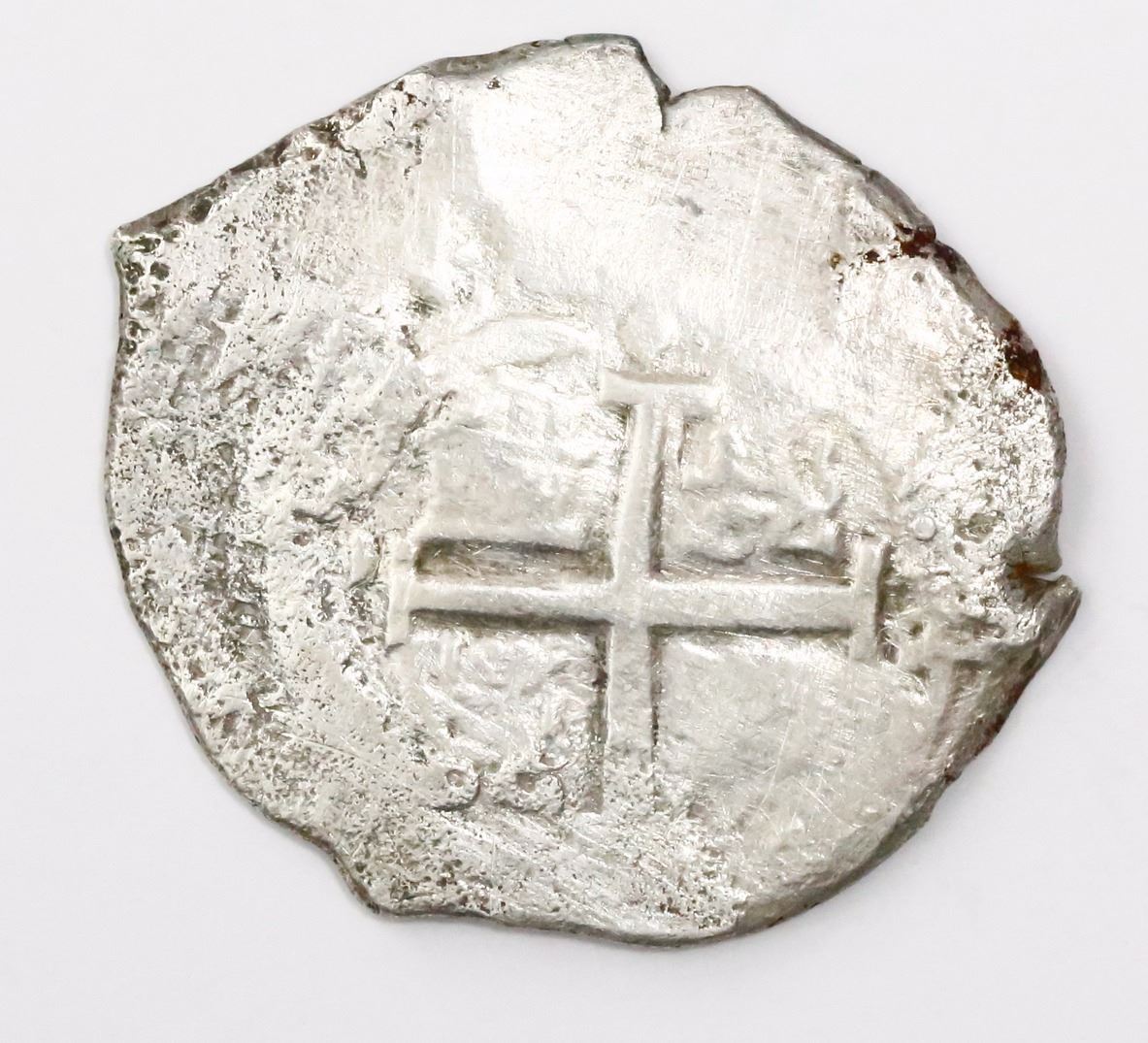 Potosi, Bolivia, cob 8 reales, 1676E. S-P37b; KM-26; CT-351. 25.13 grams. Bold full pillars and good full cross (off-center), big flan, some moderate corrosion but much better than most from this wreck. Recovered from: Consolacion, sunk in 1681 off Santa Clara Island, Ecuador