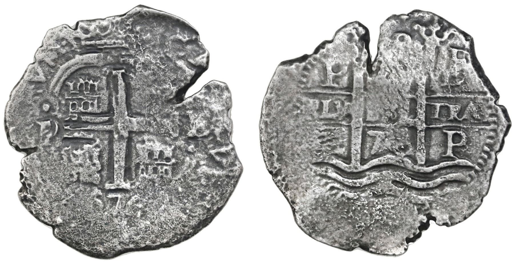Potosi, Bolivia, cob 8 reales, 1676E. S-P37b; KM-26; CT-351. 17.93 grams. Broad flan with full pillars-and-waves and nearly full cross, flat peripheries, two weak but certain dates, typical corrosion, edge-split, lightly toned. Recovered from: Consolacion, sunk in 1681 off Santa Clara Island, Ecuador