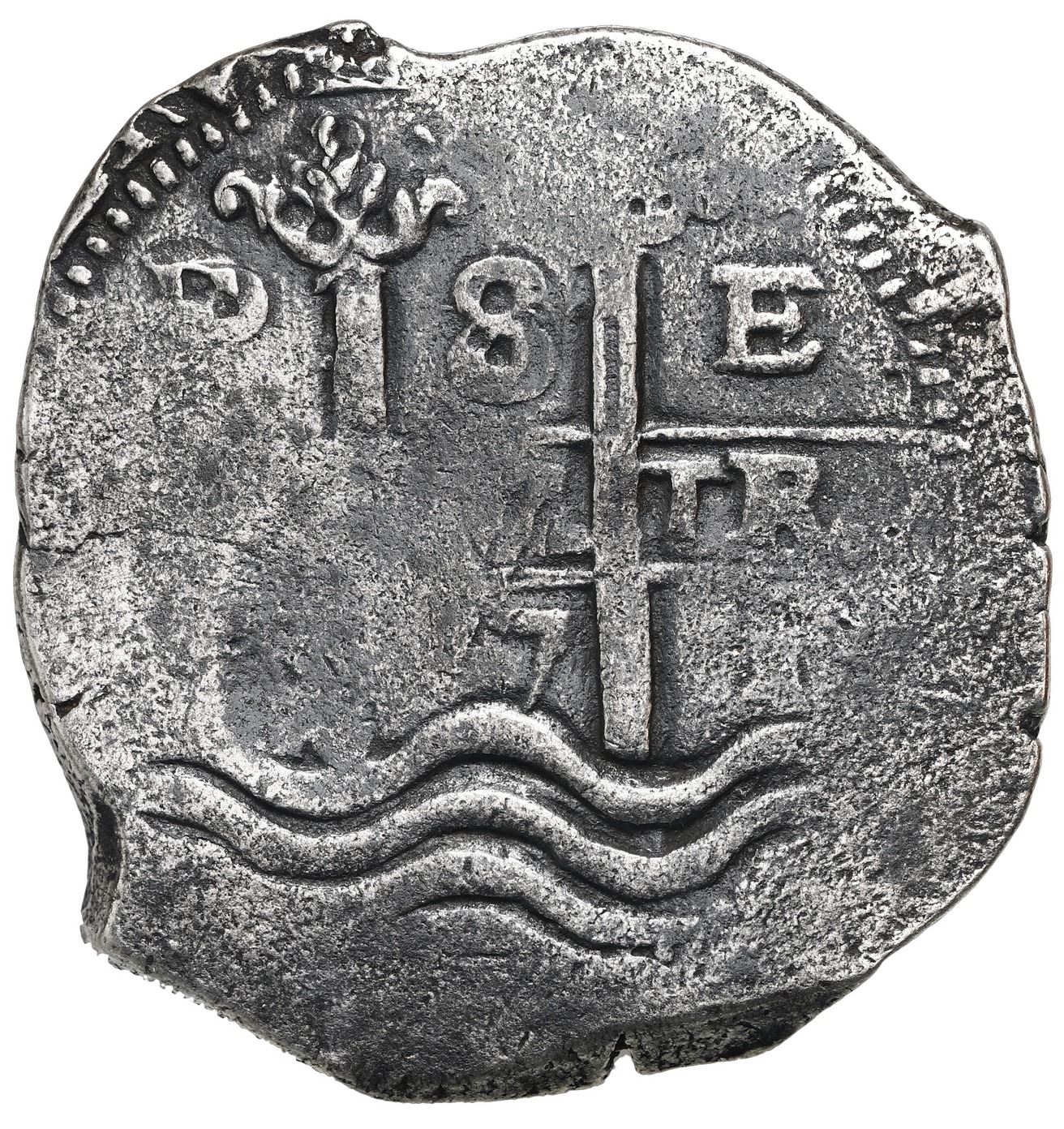 Potosi, Bolivia, cob 8 reales, 1677 E. S-P37b; KM-26; Cal-709. 25.78 grams. Choice for this wreck as solid and uncorroded, 100% full waves, most of pillars and cross despite flatness (as made), two dates, one assayer and one castle choice, nicely toned. Pedigreed to the Ponterio Sale #69 of June 4, 1994, lot 155, with lot tag. From: Consolacion, sunk in 1681 off Santa Clara Island, Ecuador