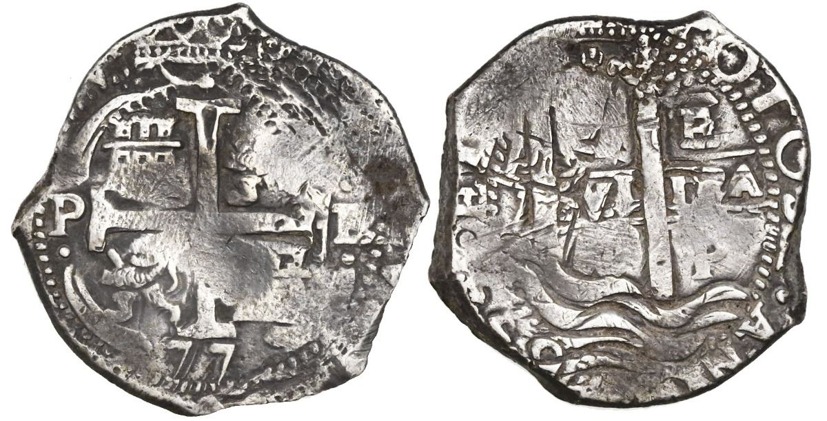Potosi, Bolivia, cob 8 reales, 1677E. S-P37b; KM-26; CT-352. 27.80 grams. Full but doubled pillars-and-waves, full cross, toned Fine+ with lots of flat spots, bold date below cross and second date in legend.