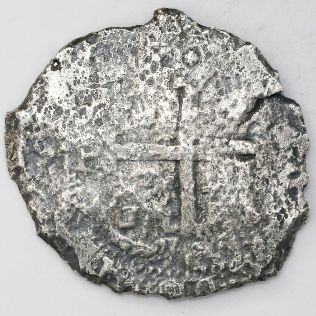 Potosi, Bolivia, cob 8 reales, 1677E. S-P37b; KM-26; CT-352. 22.28 grams. Crude corrosion (especially on cross side) but bold pillars, parts of all three dates. With Daniel Frank Sedwick, LLC photo-certificate. Recovered from: Consolacion, sunk in 1681 off Santa Clara Island, Ecuador