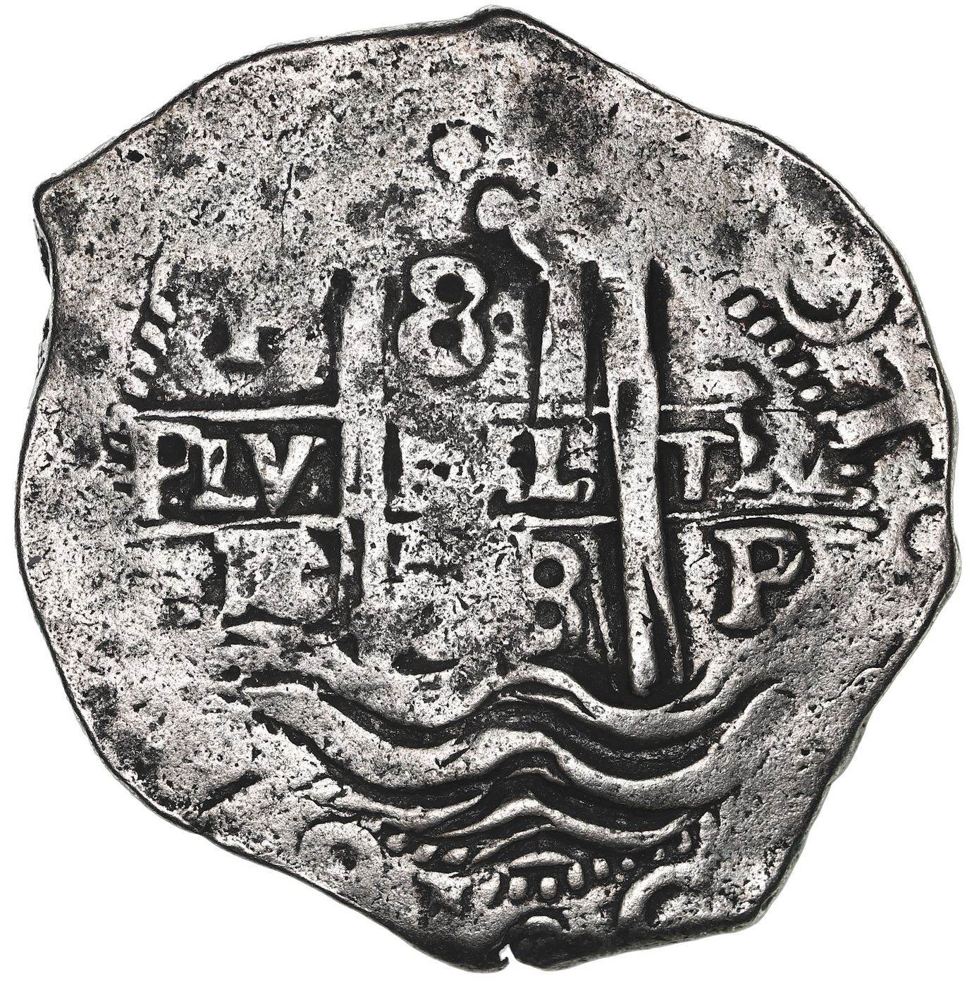 Potosi, Bolivia, cob 8 reales, 1678 E. S-P37b; KM-26; Cal-711. 25.93 grams. Full but partially flat pillars-and-waves and cross-lions-castles, bold dot-pomegranate-dot above cross, parts of all three dates, slightly porous VF with contrasting toning. Pedigreed to the Ponterio auction of July 1994, with original lot-tag 804.