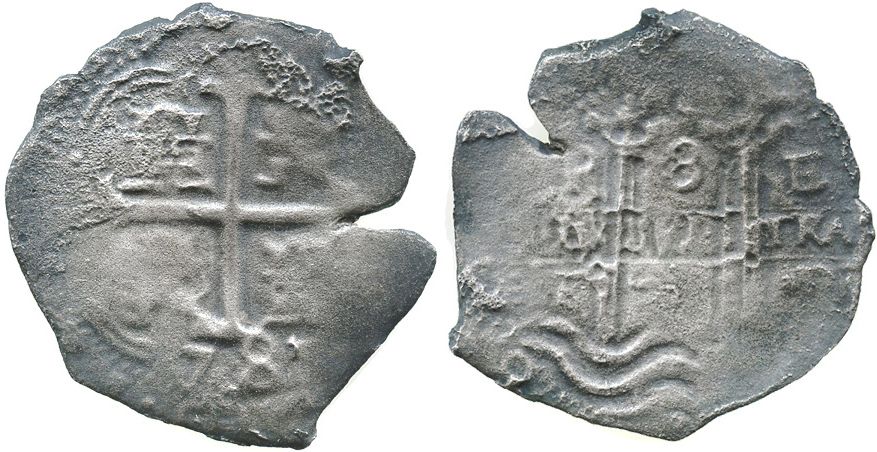 Potosi, Bolivia, cob 8 reales, 1678E. S-P37b; KM-26; CT-354. 14.5 grams. Thin from heavy corrosion but with full pillars-and-waves and cross, 2 dates, nicely toned. Recovered from: Consolacion, sunk in 1681 off Santa Clara Island, Ecuador