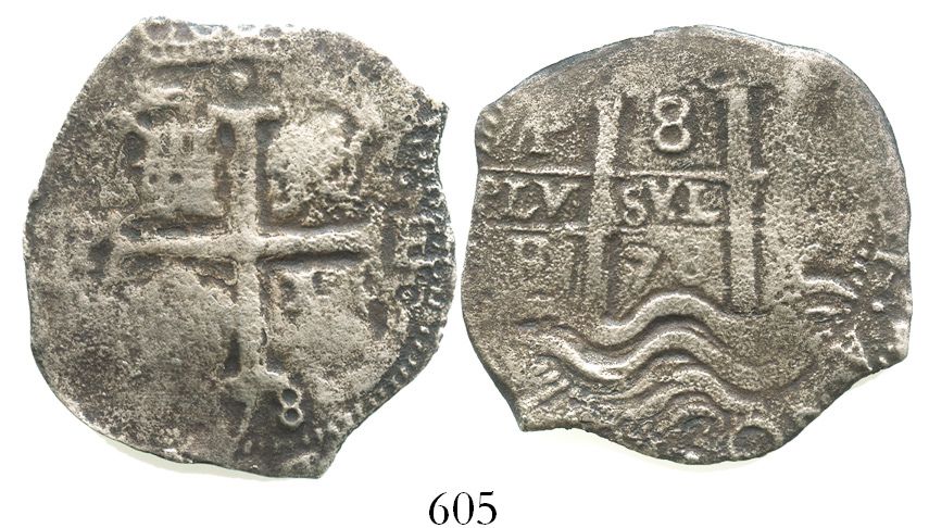 Potosi, Bolivia, cob 8 reales, 1678E. S-P37b; KM-26; CT-354. 15.1 grams. Choice full pillars-and-waves and good full cross despite moderate corrosion, 2 dates and assayers, nicely toned. With photo-certificate. Recovered from: Consolacion, sunk in 1681 off Santa Clara Island, Ecuador