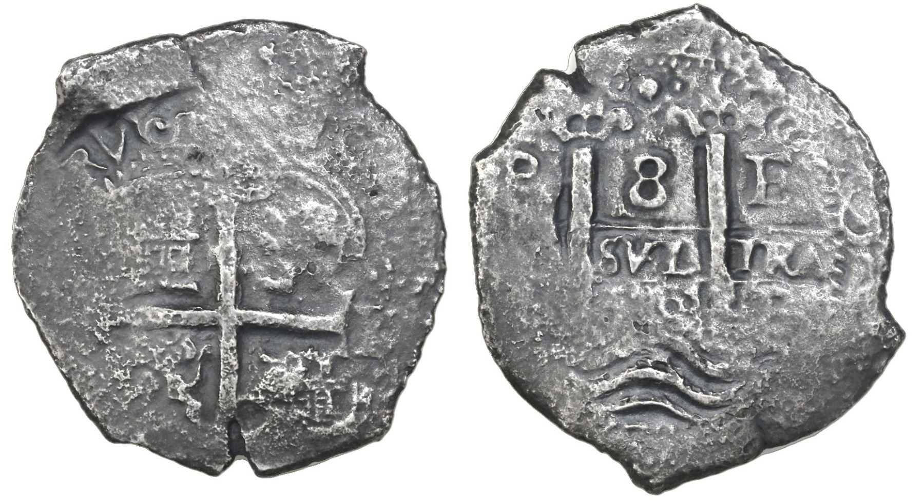 Potosi, Bolivia, cob 8 reales, 1678E. S-P37b; KM-26; CT-354. 20.99 grams. Bold but off-center cross, bold full pillars-and-waves, moderate corrosion, gunmetal toning. Recovered from: Consolacion, sunk in 1681 off Santa Clara Island, Ecuador