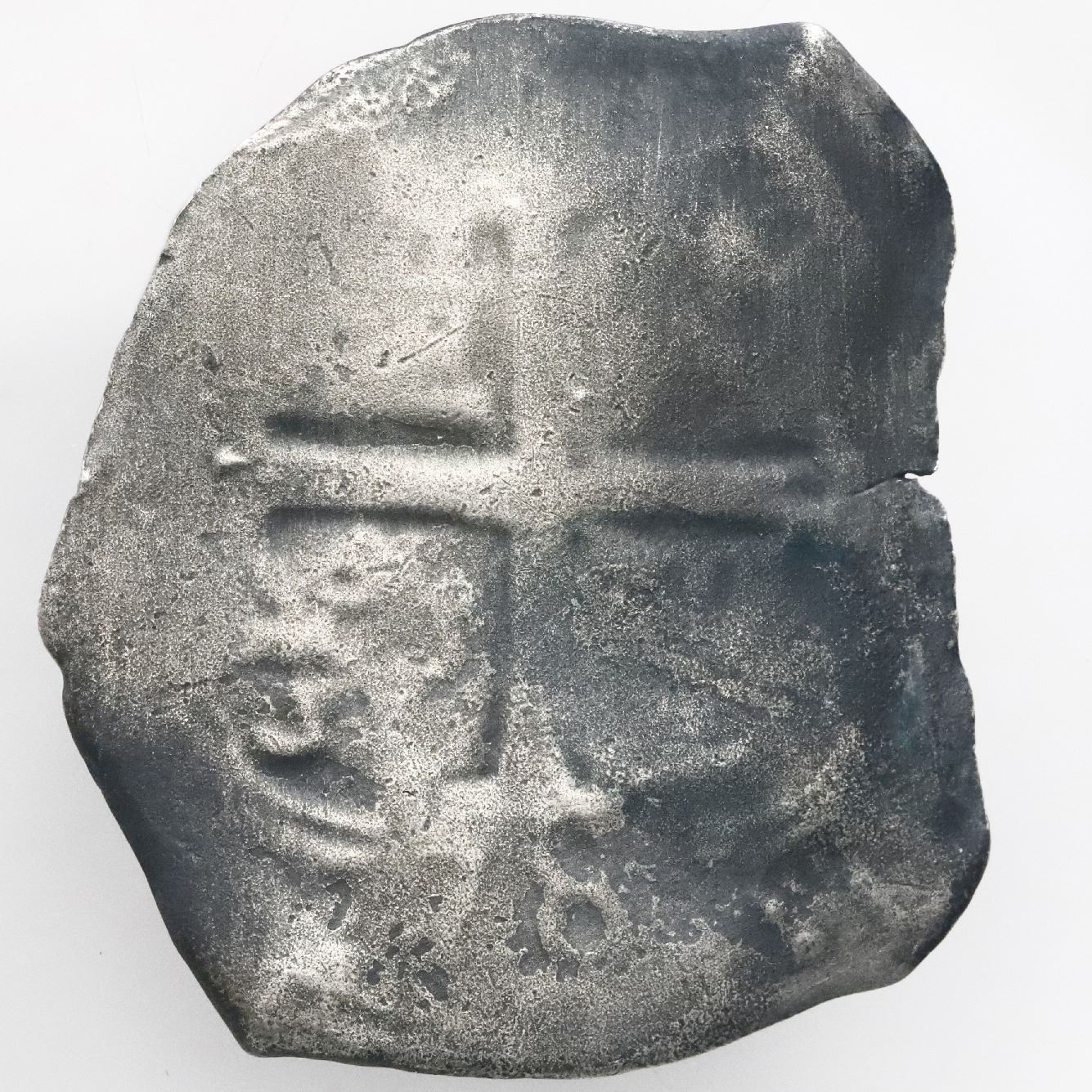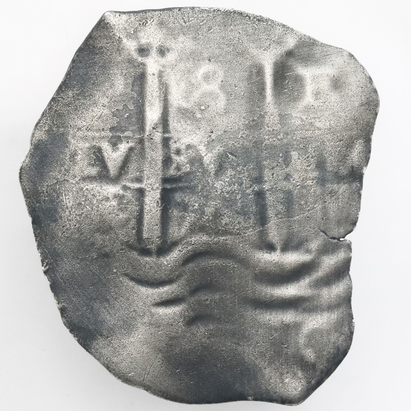 Potosi, Bolivia, cob 8 reales, 1678E. S-P37b; KM-26; Cal-711. 13.67 grams. Smooth and thin along the edges, some detail remaining including clear date, slate gray toned. With photo-certificate. From: Consolacion, sunk in 1681 off Santa Clara Island, Ecuador