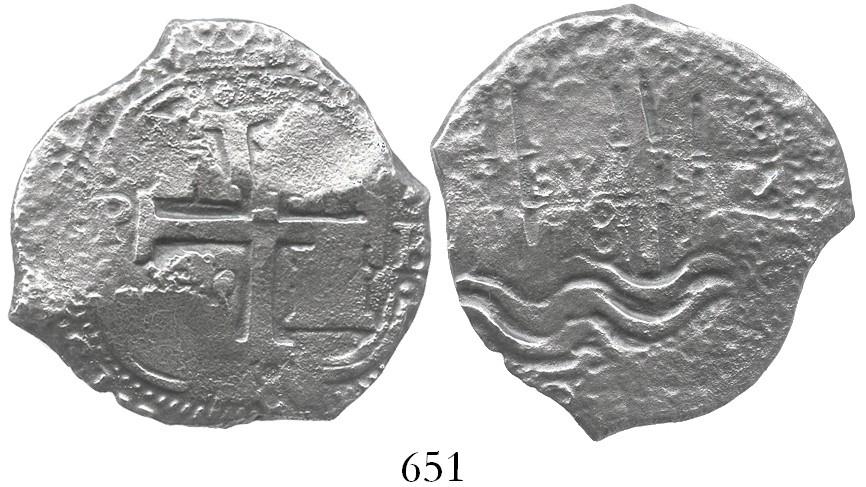 Potosi, Bolivia, cob 8 reales, 1678E. S-P37b; KM-26; CT-354. 20.9 grams. Bold but doubled waves and cross, 2 dates, solid (light corrosion only). From the Consolacion, sunk in 1681 off Santa Clara Island, Ecuador, with ROBCAR photo-certificate #M090209.