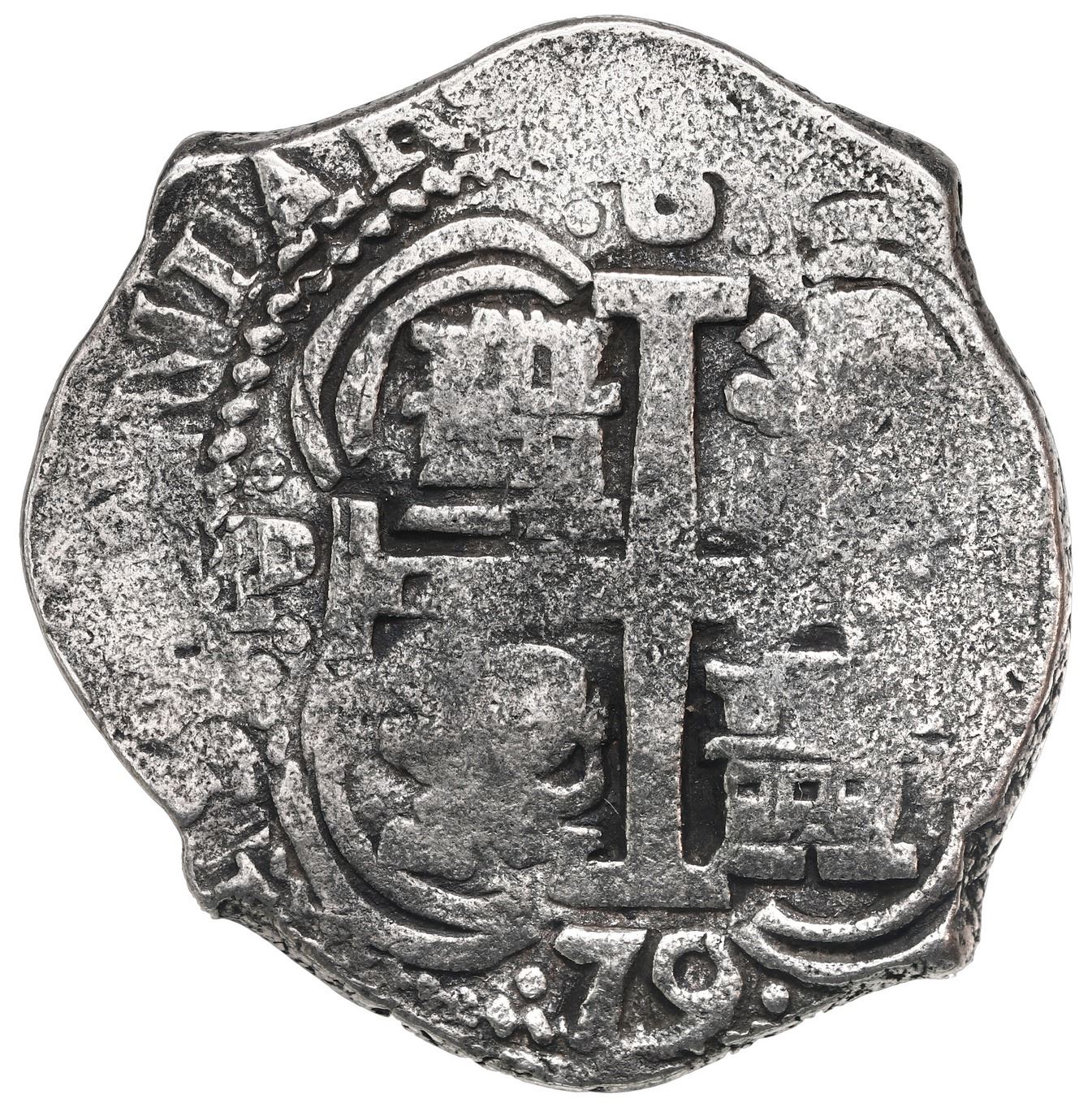 Potosi, Bolivia, cob 8 reales, 1679 V. S-P39; KM-26; Cal-716. 25.28 grams. Minimal surface corrosion but darkly toned and somewhat weakly struck, with full pillars and cross (the latter with bold date), three mintmarks. Pedigreed to the Ponterio Sale #93 of March 13-14, 1998 (CICF), lot 1256, with lot tag. From: Consolacion, sunk in 1681 off Santa Clara Island, Ecuador