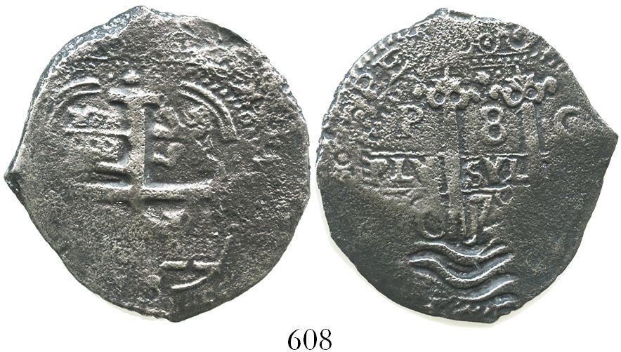 Potosi, Bolivia, cob 8 reales, 1679C. S-P38; KM-26; CT-357. 19.3 grams. Good tops of pillars and top of cross, also bold waves, 2 assayers, nicely toned. Recovered from: Consolacion, sunk in 1681 off Santa Clara Island, Ecuador
