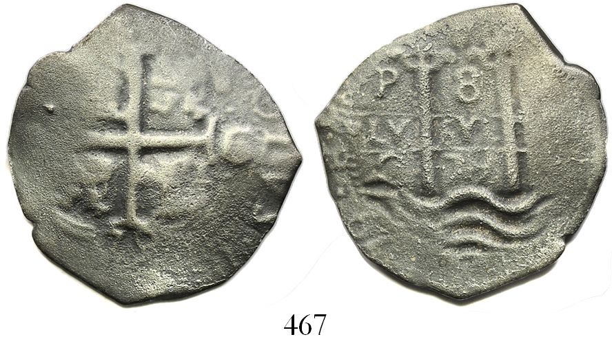 Potosi, Bolivia, cob 8 reales, 1679C. S-P38; KM-26 ;CT-357. 14.16 grams. Good full pillars and nearly full cross despite wear and corrosion (thin), three dates, deeply toned. With photo-certificate, and pedigreed to our Auction #5, with original lot-tag #307. Recovered from: Consolacion, sunk in 1681 off Santa Clara Island, Ecuador