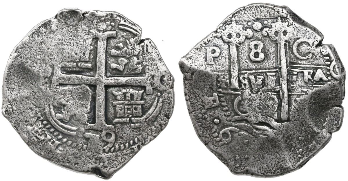 Potosi, Bolivia, cob 8 reales, 1679C. S-P38; KM-26; CT-357. 25.63 grams. Choice bold cross and pillars (the latter slightly doubled), with three dates and assayers, solid and virtually uncorroded, lightly toned with contrast around details. Pedigreed to the Charles Eidel collection. Recovered from: Piedmont, sunk in 1795 off Dorset, England