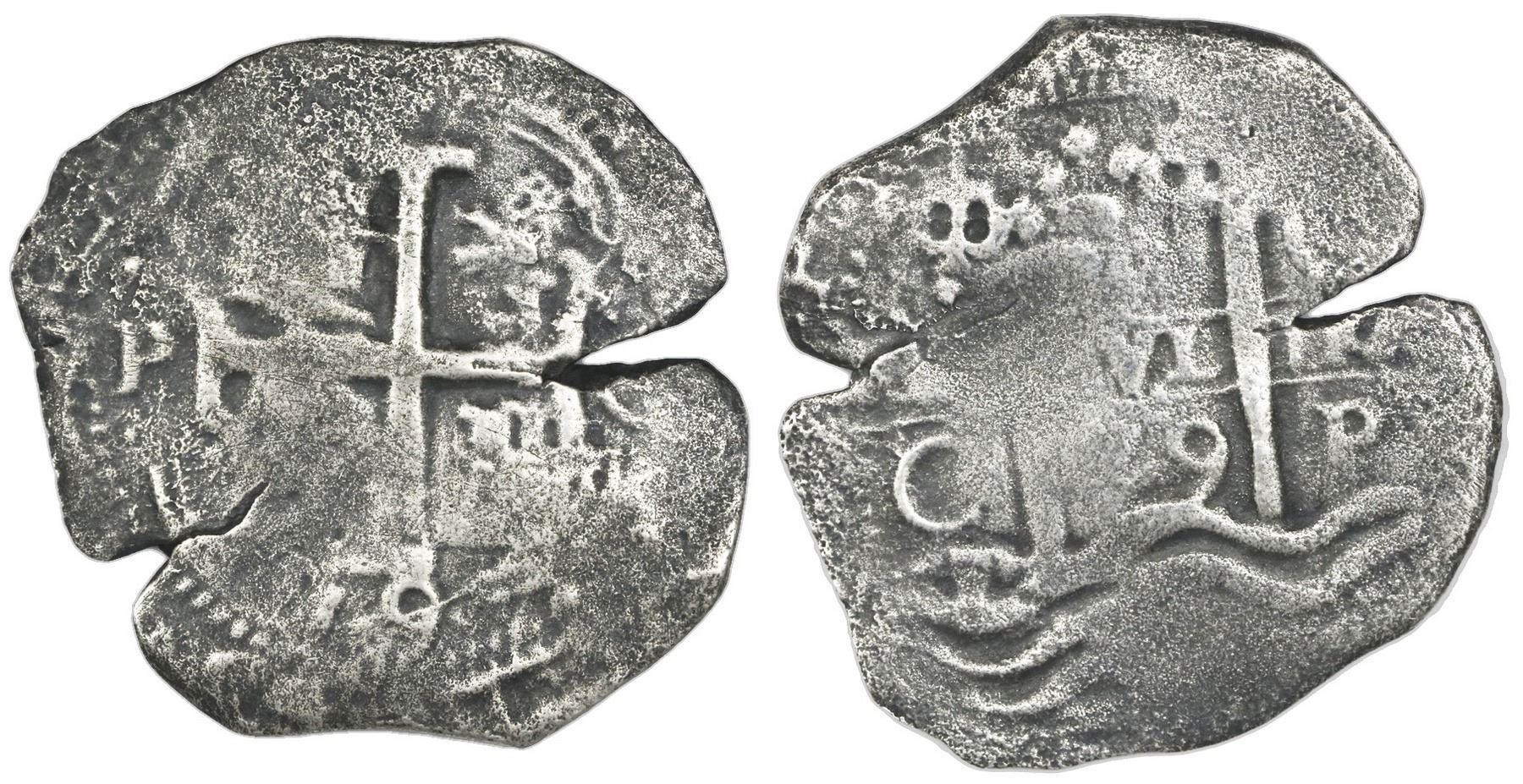 Potosi, Bolivia, cob 8 reales, 1679C. S-P38; KM-26; CT-357. 15.68 grams. Typically thin from wear and corrosion but with clear assayer and date above waves, nearly full cross with second date below, deeply toned all over. Recovered from: Consolacion, sunk in 1681 off Santa Clara Island, Ecuador