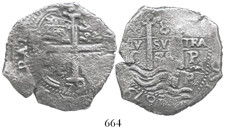 Potosi, Bolivia, cob 8 reales, 1679C. S-P38; KM-26; CT-357. 21.1 grams. Two dates (full 1679 in legend), corroded and slightly doubled. From the Consolacion, sunk in 1681 off Santa Clara Island, Ecuador, with ROBCAR photo-certificate #M100235.