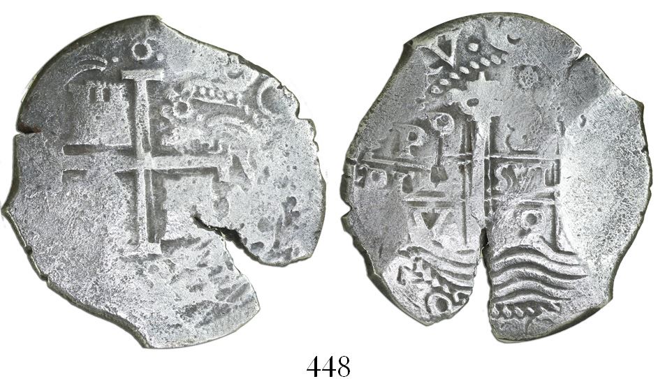 Potosi, Bolivia, cob 8 reales, 1679V, encapsulated ANACS F 12 (with name of wreck inside slab). S-P39; KM-26; CT-359. Nearly corrosion-free (rare for this wreck), with good full cross (slightly off-center) and one full pillar (doubled) above full waves, parts of three dates, large edge-split. Recovered from: Consolacion, sunk in 1681 off Santa Clara Island, Ecuador