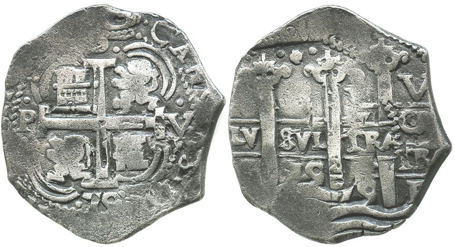 Potosi, Bolivia, cob 8 reales, 1679V. S-P39; KM-26; CT-359. 26.4 grams. THREE bold pillars due to doubling, choice full cross (also slightly doubled), 2 dates and assayers, CAR- of king's name, toned AVF with very light surface corrosion (unidentified salvage).