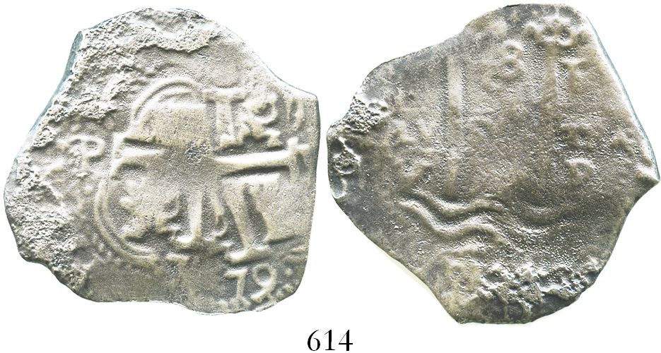 Potosi, Bolivia, cob 8 reales, 1679V. S-P39; KM-26; CT-359. 17.2 grams. Very thin from corrosion but with clear pillars-and-waves and cross (the latter doubled) with bold date below. With photo-certificate. Recovered from: Consolacion, sunk in 1681 off Santa Clara Island, Ecuador