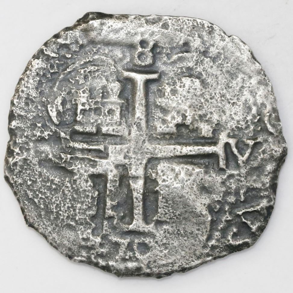 Potosi, Bolivia, cob 8 reales, 1679V. S-P39; KM-26; CT-359. 19.68 grams. Good full pillars and cross but both doubled, two bold dates (one in legend, the other below cross), moderately corroded but nicely toned. With Daniel Frank Sedwick, LLC photo-certificate. Recovered from: Consolacion, sunk in 1681 off Santa Clara Island, Ecuador