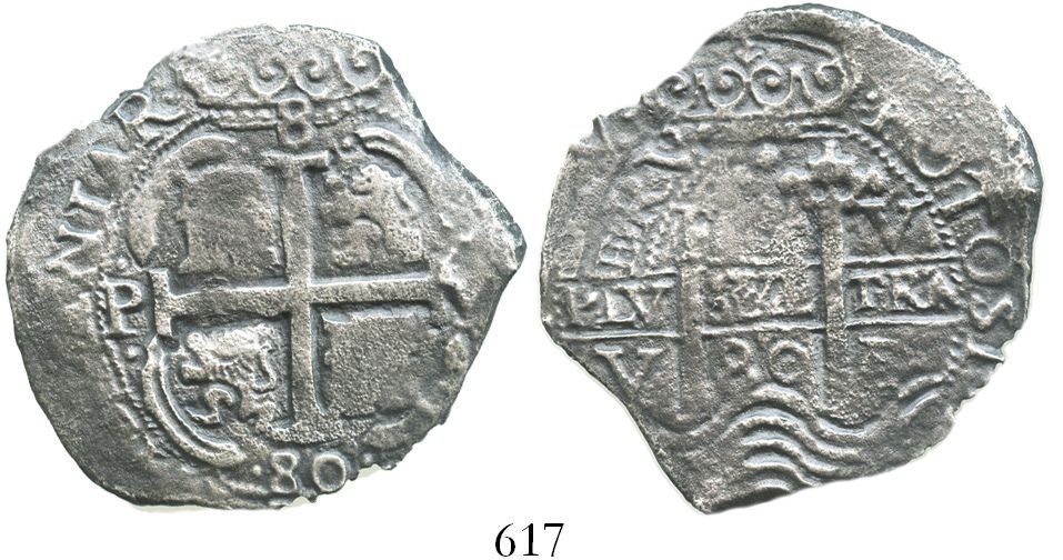 Potosi, Bolivia, cob 8 reales, 1680V. S-P39; KM-26; CT-361. 19.0 grams. Choice detail on both sides despite light corrosion, with full crown, pillars-and-waves, cross-lions-castles, full POTOSI, 2 dates and assayers. With photo-certificate #M100123 from the salvagers. Recovered from: Consolacion, sunk in 1681 off Santa Clara Island, Ecuador