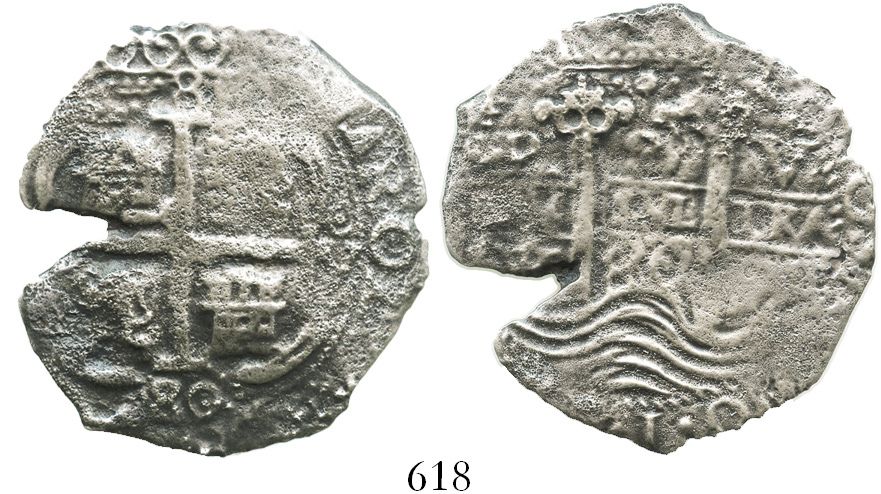 Potosi, Bolivia, cob 8 reales, 1680V. S-P39; KM-26; CT-361. 18.4 grams. Roundish flan with large edge-split, full but slightly doubled pillars-and-waves, full cross, full king's name, 2 dates, typical corrosion. Recovered from: Consolacion, sunk in 1681 off Santa Clara Island, Ecuador