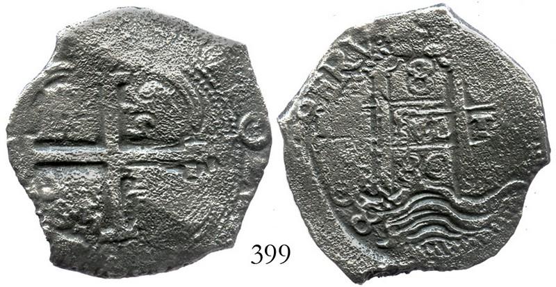 Potosi, Bolivia, cob 8 reales, 1680V. S-P39; KM-26; CT-361. 20.6 grams. Full cross, bold waves with 2 dates on that side, full PERV in legend, much flatness and minor pitting. With ROBCAR certificate #M090292. Recovered from: Consolacion, sunk in 1681 off Ecuador