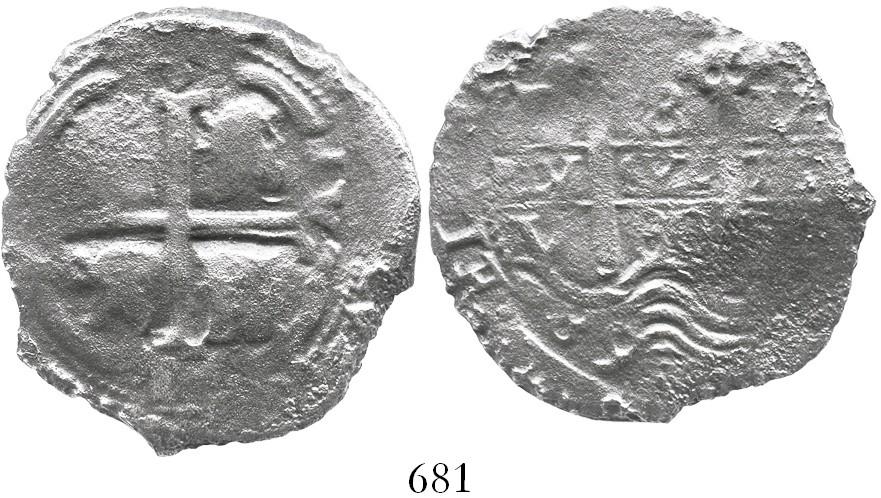 Potosi, Bolivia, cob 8 reales, 1680V. S-P39; KM-26; CT-361. 18.6 grams. Full but corroded cross and pillars, 2 dates on pillars side. From the Consolacion, sunk in 1681 off Santa Clara Island, Ecuador, with ROBCAR photo-certificate #M090208.
