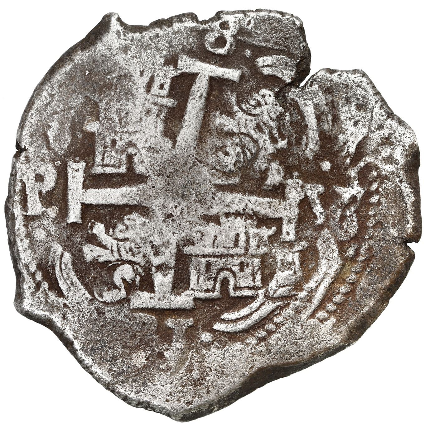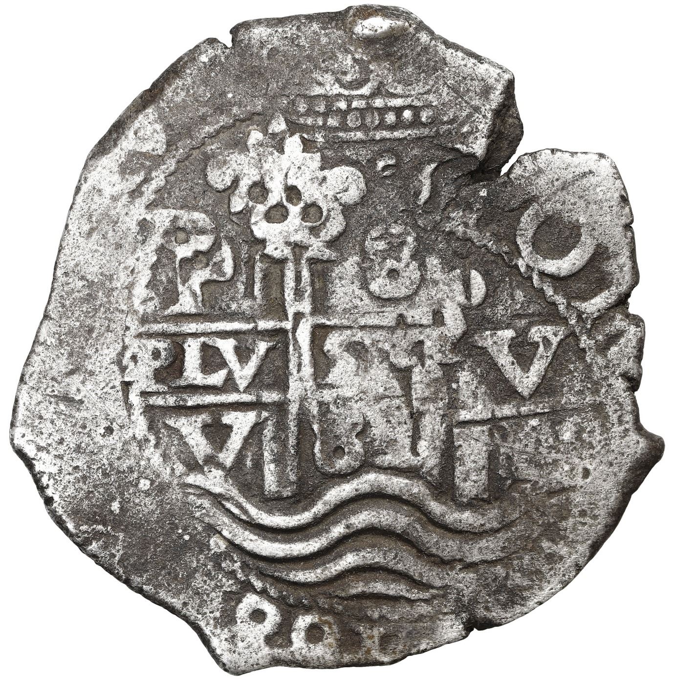Potosi, Bolivia, cob 8 reales, 1681 V. S-P39; KM-26; Cal-719. 26.83 grams. Full but doubled cross and pillars-and-waves, three dates and assayers, VF details with contrasting brown toning but surfaces lightly porous, one small edge-crack. Pedigreed to the Ponterio auction of June 1994, with original lot-tag 158.