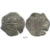 Potosi, Bolivia, cob 8 reales, 1681V. S-P39; KM-26; CT-363. 24.7 grams. Nice full cross, full but doubled pillars-and-waves, salvaged VF with edge-crack.