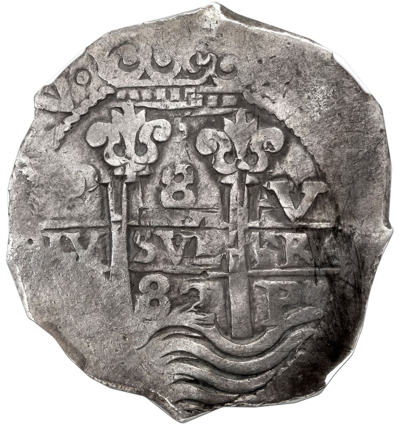 Potosi, Bolivia, cob 8 reales, 1682 V, NGC XF 45. S-P39; KM-26; Cal-720. 27.50 grams. Choice full cross-lions-castles and pillars-and-waves (the tops of the pillars particularly choice), two dates, three mintmarks, nicely toned, second finest in NGC census behind a single AU 55.