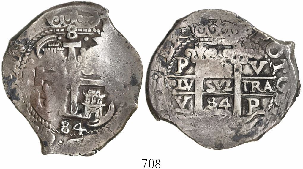 Potosi, Bolivia, cob 8 reales, 1684V. S-P39; KM-26; CT-366. 27.16 grams. Full pillars and crown with very bold date and P's and V's (two each), full but partially flat cross with bold date below, toned AVF with flat areas.